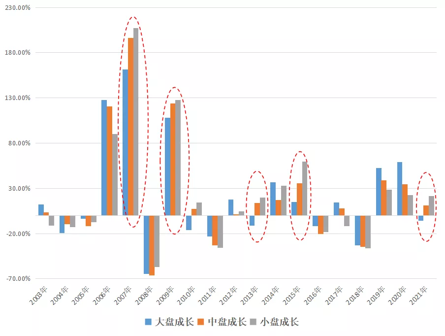 另一方面,即便是近年阶段性占优的成长风格,内部在大中小盘风格上也出现了明显分歧。2007年、2009年、2013年、2015年及今年以来的成长风格,呈现出中小盘大幅跑赢大盘的情况。当然,成长风格绝非单纯地偏向中小盘,比如2006年、2012年、2017年、2019年、2020年则是大盘成长为王的局势。