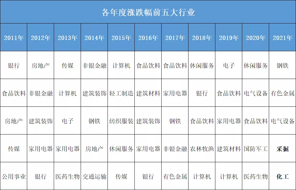 近10年,每年各行业涨跌幅排名前五的行业各不相同,物换星移几乎是可以预见的结局。特别是今年兴起的采掘、化工行业,处在近十个年度首次上榜前五的高光时刻。