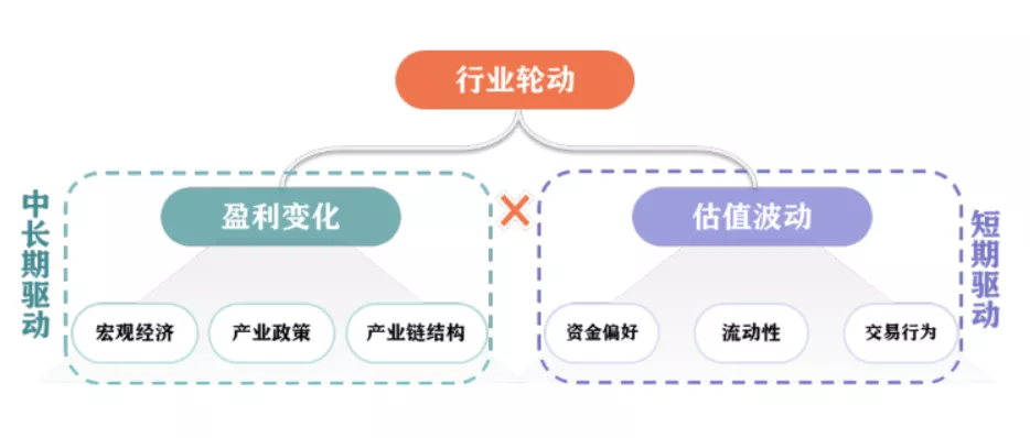 轮动背后的逻辑是各行业在不同阶段所处的产业周期不同,短期驱动力来源于资金偏好、流动性、交易行为形成的估值波动,中长期驱动则是由宏观经济、产业政策、产业链结构影响下的盈利变化。