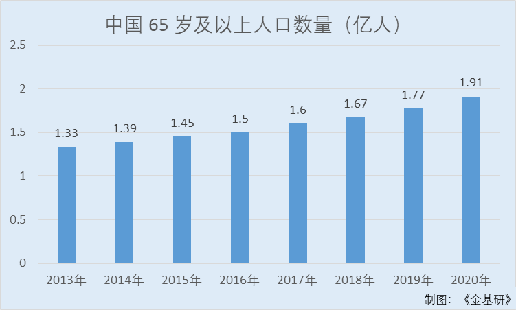 与此同时,中国人口总量稳步增长,人口老龄化趋势不断加剧。根据国家统计局数据显示,2013-2020年,中国65岁及以上人口数量从1.33亿人增加至1.91亿人,未来中国老龄化人口数量将进一步增长。