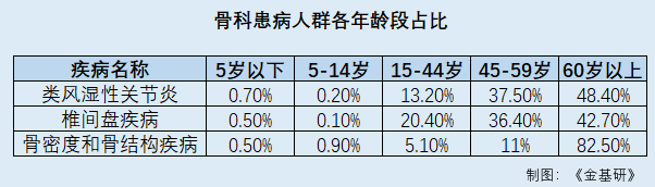 而骨科疾病发病率与年龄相关性极高,随着年龄的增长,人体发生骨折、脊柱侧弯、脊椎病、关节炎、关节肿瘤等骨科疾病的概率大幅上升。根据《中国健康卫生统计年鉴(2019)》关于“2018年中国医院出院病人年龄与疾病构成”的数据统计,在骨科患病(以类风湿性关节炎、椎间盘疾病、骨密度和骨结构疾病为例)人群中,60岁以上年龄阶段的人群占比远高于该年龄段以下的人群占比。