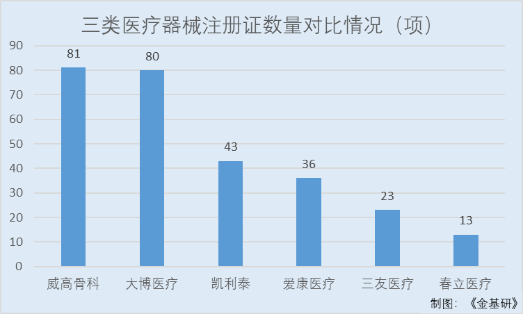 观其同行业可比上市公司,大博医疗三类医疗器械注册证为80项;凯利泰三类医疗器械注册证为43项;三友医疗三类医疗器械注册证为23项;爱康医疗三类医疗器械注册证为36项;春立医疗三类医疗器械注册证为13项。