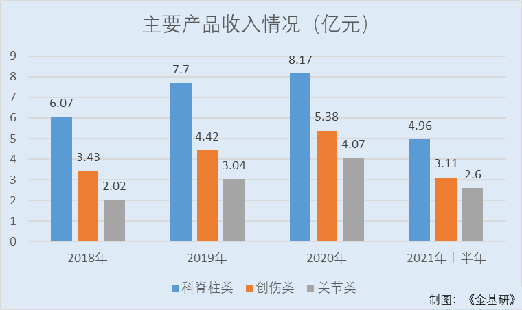 2021年上半年,威高骨科的脊柱类产品实现销售收入4.96亿元,同比增长33.94%;创伤类产品实现销售收入3.11亿元,同比增长28.27%;关节类产品实现销售收入2.6亿元,同比增长37.75%。