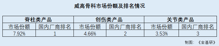 在脊柱类植入器械领域,威高骨科市场占有率国内领先,创伤类和关节类植入器械领域市场占有率处于行业前列,具备较强的产品竞争力和品牌优势。