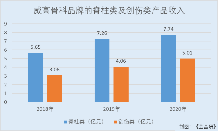 2018-2020年,威高骨科脊柱类产品的销售收入分别为6.07亿元、7.7亿元、8.17亿元;创伤类产品的销售收入分别为3.43亿元、4.42亿元、5.38亿元;关节类产品的销售收入分别为2.02亿元、3.04亿元、4.07亿元。