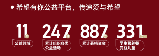 十一年来,新乳业累计组织各类公益活动247场,累计募捐资金887万元,学生营养餐受益儿童331万人。
