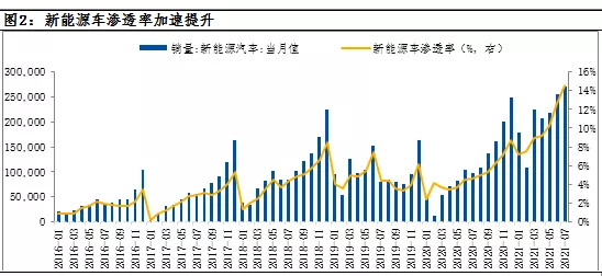 对于新能源汽车这个新兴产业而言,渗透率水平决定着当前的起点位置和未来的行业格局。据乘联会数据,7月底国内新能源汽车渗透率已经达到14.5%,仅仅从绝对数字或难感受到行业发展的迅速。更为直观的是与过去进行对比,会发现新能源车渗透率从2016年6月的2%提升至2018年11月的6%,经历了2年多的时间,从2018年11月的6%提升至2021年5月的10%,经历了近3年时间,而从2021年5月的10%提升至2021年7月的14%仅用了2个月。由此可见,新能源车渗透率已经熬过了初创期的漫长艰苦岁月,进入到依靠行业自驱力加速渗透阶段。