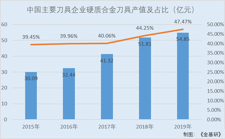 2015-2019年,国内主要刀具企业生产的硬质合金刀具的产值分别为30.09亿元、32.44亿元、41.32亿元、51.81亿元、54.85亿元;占刀具总产值的比例分别为39.45%、39.96%、40.06%、44.25%、47.47%,产值及占比均逐步提升。
