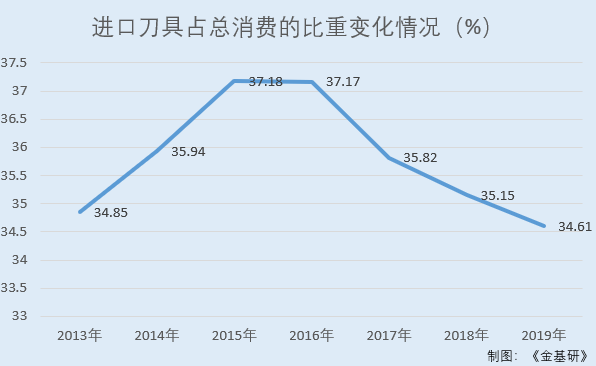 据机床工具工业协会统计数据,2016-2019年进口刀具占总消费的比重从37.17%下降至34.61%,一定程度上说明国内数控刀具的自给能力在逐步增强,进口依赖度在逐年降低。