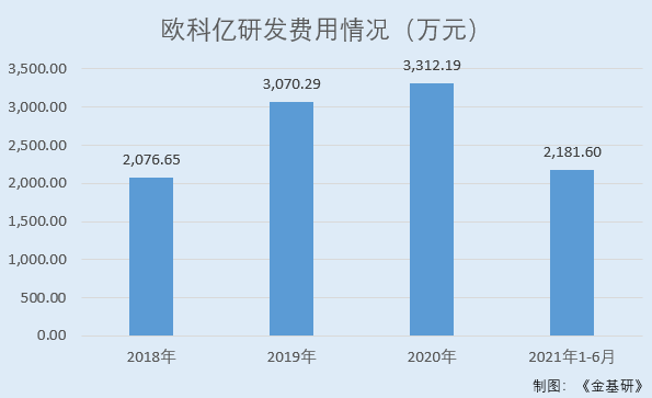 2018-2020年及2021年1-6月,欧科亿研发投入分别为2,076.65万元、3,070.29万元、3,312.19万元、2,181.6万元,呈逐年上涨趋势。