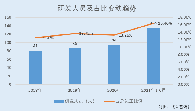 同时,欧科亿研发人员也在持续增加。2018-2020年及2021年1-6月,欧科亿研发人员分别为81人、86人、94人、135人,占当期总员工人数比例分别为12.56%、13.72%、13.26%、16.46%。