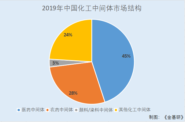 根据前瞻网的统计,2019年医药中间体、农药中间体、颜料/染料中间体、其他化工中间体在中国化工中间体市场中分别占比45%、28%、3%、24%。