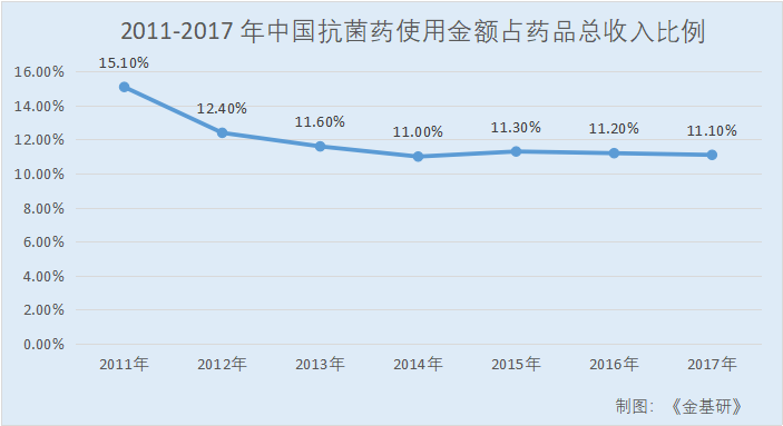2011-2017年,中国抗菌药使用金额占药品收入比例分别为15.1%、12.4%、11.6%、11%、11.3%、11.2%、11.1%。