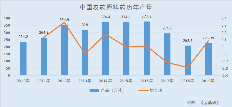据同花顺iFinD数据,2010-2019年,中国农药原料药产量分别为234.2万吨、264.8万吨、354.9万吨、319万吨、374.4万吨、374.1万吨、377.8万吨、294.1万吨、208.3万吨、225.39万吨。