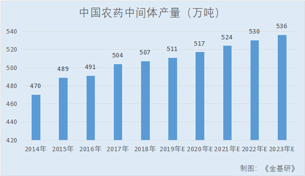 根据国金证券研究所整理,2014-2018年中国农药中间体产量分别为470万吨、489万吨、491万吨、504万吨、507万吨,预计2023年产量将达到536万吨。