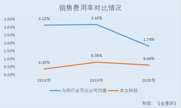 同期,本立科技同行业可比公司的销售费用率均值分别为3.12%、3.16%、1.79%。