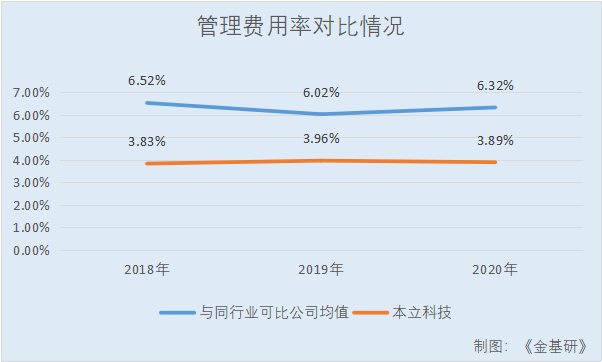 同期,本立科技同行业可比公司的管理费用率均值分别为6.52%、6.02%、6.32%。