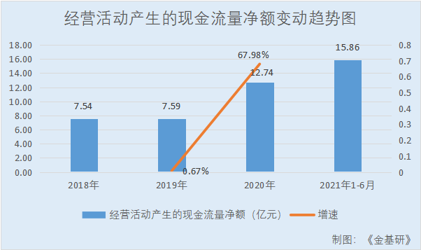 2018-2020年及2021年1-6月,维远股份经营活动产生的现金流量净额分别为7.54亿元、7.59亿元、12.74亿元、15.86亿元。2019年、2020年维远股份经营活动产生的现金流量净额的增速分别为0.67%、67.98%。