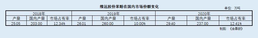 国内市场方面,截至2020年底,国内苯酚总产能约为371.17万吨,其中,维远股份凭借产能44万吨/年,居国内苯酚产能前五大厂商之首。