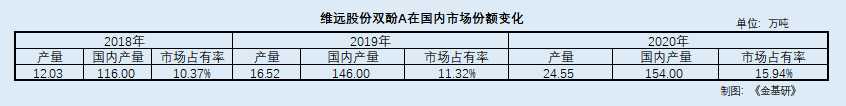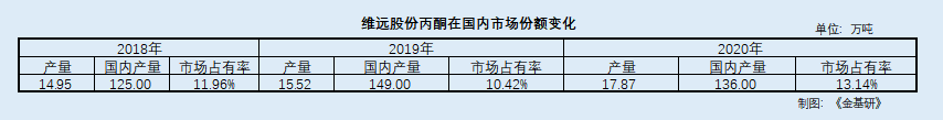 截至2020年年底,维远股份凭借产能26吨/年,位列国内丙酮产能前五大厂商的首位。