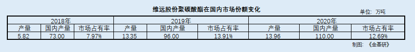 可见,维远股份的聚碳酸酯产品于2018年6月正式投产。然而,2020年维远股份聚碳酸酯产品已占全国的市场份额的12.69%。