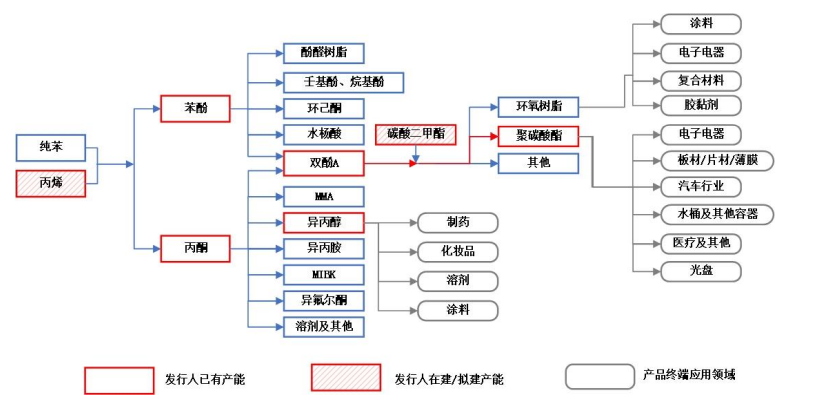 可以看出,“苯酚、丙酮-双酚A-聚碳酸酯”以纯苯、丙烯为主要原材料,产业链上的苯酚、丙酮和双酚A等产品既是“苯酚、丙酮-双酚A-聚碳酸酯”产业链中的原材料,同时还有其他丰富用途,如丙酮用于生产甲基丙烯酸甲酯(MMA)、异丙醇(IPA)等,苯酚用于生产酚醛树脂、己内酰胺、己二酸等,双酚A用于生产环氧树脂等。