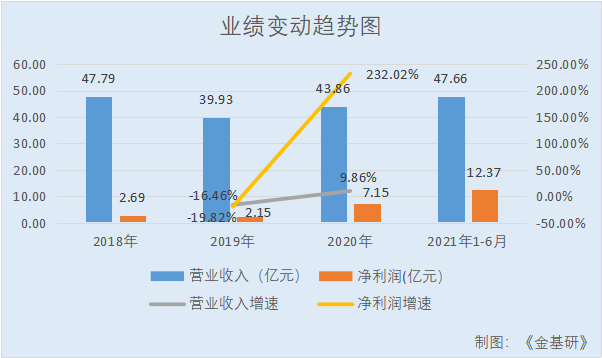 2018 -2020年及2021年1-6月,维远股份的营业收入分别为47.79亿元、39.93亿元、43.86亿元、47.66亿元。2019-2020年营业收入增速分别为-16.46%、9.86%。