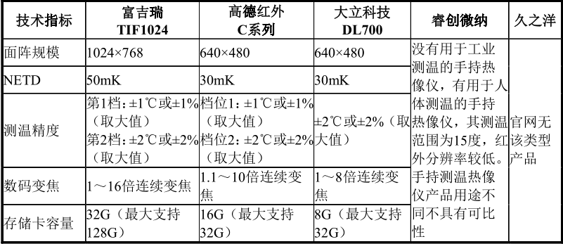 富吉瑞的TIF1024是自主研发生产的1,024×768分辨率的手持测温热像仪,是目前国内用于工业检测的最高分辨率测温热像仪;富吉瑞采用的红外探测器NETD较同行可比产品差,但是通过整机的电路设计与图像处理技术,使整机达到了与竞品相同或更优的测温精度指标。