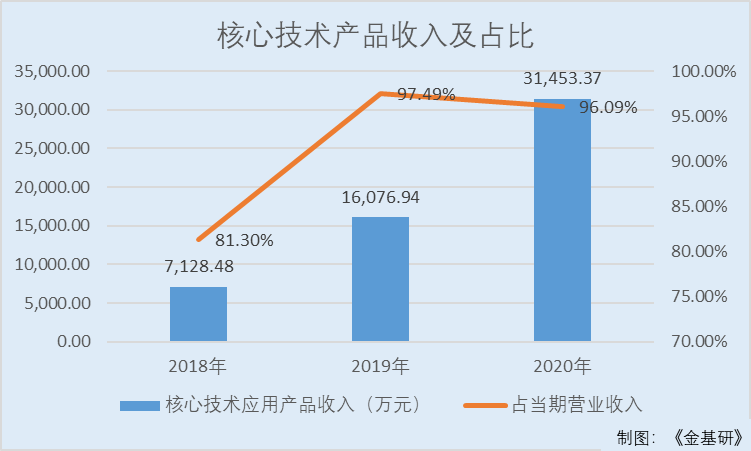 2018-2020年,富吉瑞核心技术应用产品收入一直处于较高水平,分别为7,128.48万元、16,076.94万元、31,453.37万元,占当期营业收入的比例分别为81.3%、97.49%和96.09%,使用核心技术的产品收入占比较高。