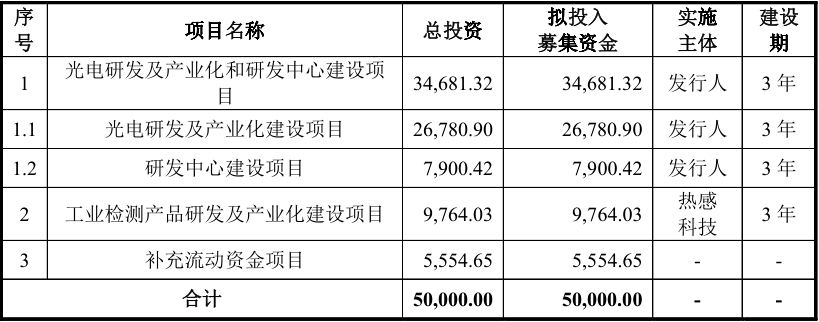 本次富吉瑞的募集资金分别投资建设“光电研发及产业化建设项目”、“研发中心建设项目”和“工业检测产品研发及产业化建设项目”,另外还有“补充流动资金项目”。