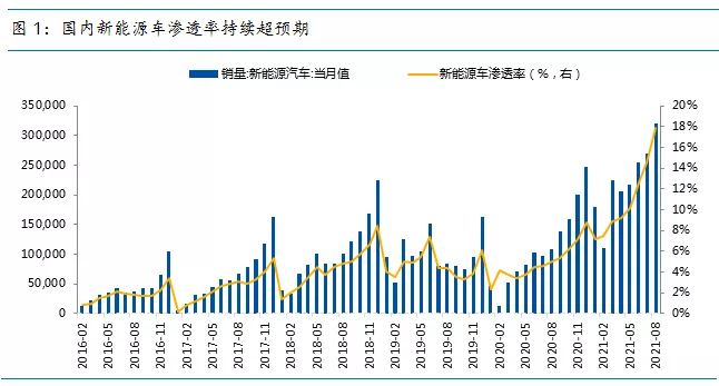 根据中汽协数据,8月国内新能源车销量为32.1万辆,渗透率为17.84%,渗透率单月+3.32%,较6月、7月分别+2.47%、+1.83%加速攀升,新能源车渗透率“J”型增长到来,全年销量预期已经从2月的180万辆上修至现在的320万辆,7、8月渗透率持续超预期。新能源车销量高增,其对上游原材料需求也超预期增长,因此伴随7、8月新能源车销量攀升,上游的锂、稀土供不应求,短期价格快速上升,从而带动了锂、稀土等“新周期”的投资机遇。