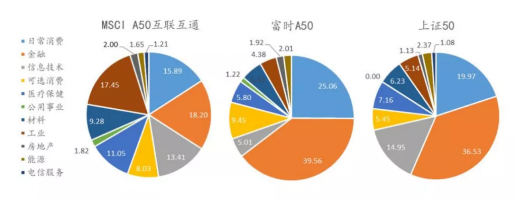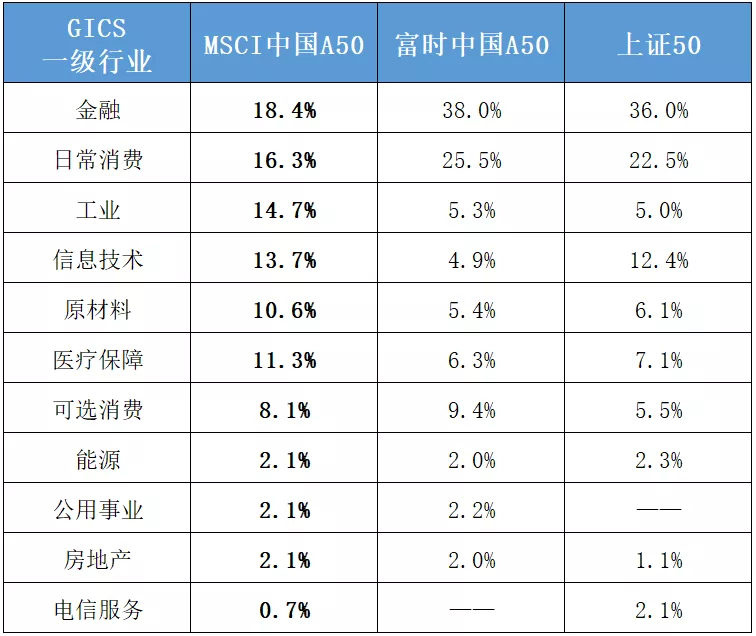 另一方面,上证50指数和富时中国A50指数在大金融和日常消费的权重则达到了60%。