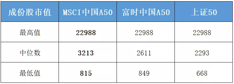 虽然同为大市值板块,但三者之间的分布仍有些许差别。MSCI中国A50侧重超大盘,成份股市值中位数达3213亿元,高于富时中国A50、上证50的2611亿元、2293亿元。