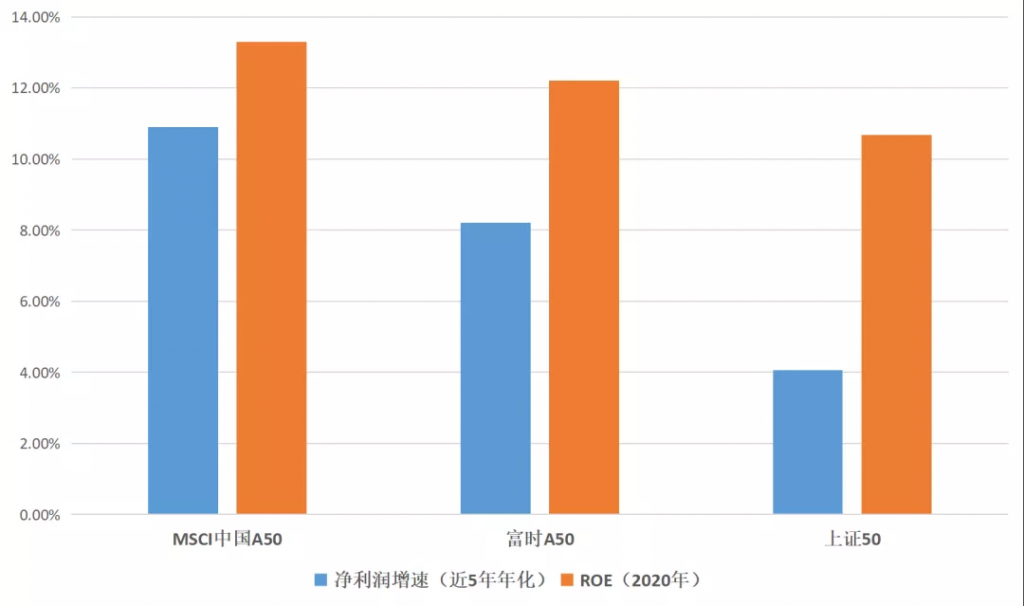 再看成长性(以近五年指数净利润复合增速为代表),MSCI中国A50同样领先于富时A50和上证50,其近5年净利润年化增速是三个50指数中唯一站上10%关口的。