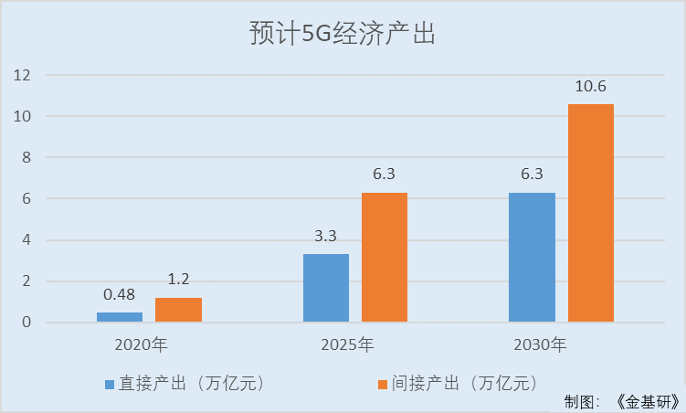 据中国信通院《5G经济社会影响白皮书》,从产出规模看,2030年,5G带动的直接产出和间接产出将分别达到6.3万亿元和10.6万亿元。