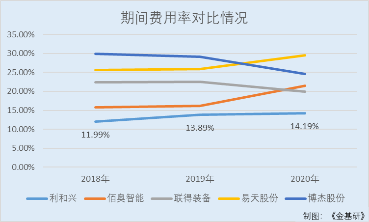 同期,利和兴同行业可比公司昆山佰奥智能装备股份有限公司的期间费用率分别为15.73%、16.23%、21.54%;深圳市联得自动化装备股份有限公司的期间费用率分别为22.33%、22.52%、19.96%;深圳市易天自动化设备股份有限公司的期间费用率分别为25.58%、25.92%、29.51%;珠海博杰电子股份有限公司的期间费用率分别为29.88%、29.13%、24.6%。