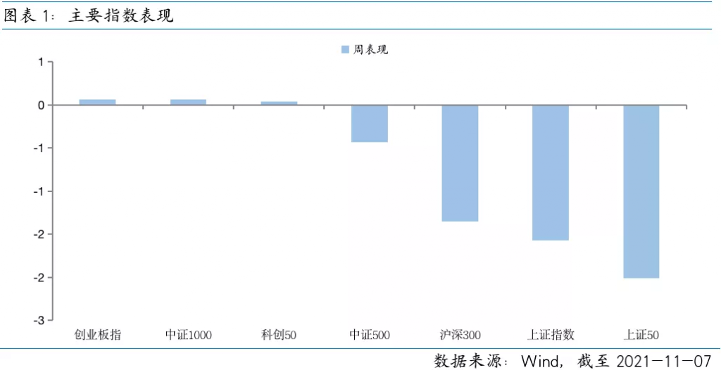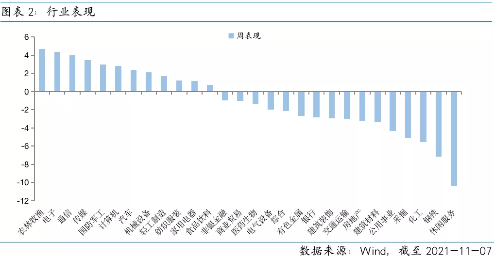 近一周指数偏弱,结构分化。主要指数中,创业板指、中证1000、科创50指数基本平盘,其他指数录得负收益。行业上,农林牧渔、电子、通信领涨,分别+4.67%、+4.37%和4.00%,休闲服务、钢铁、化工领跌,分别-10.37%、-7.14%和-5.54%。