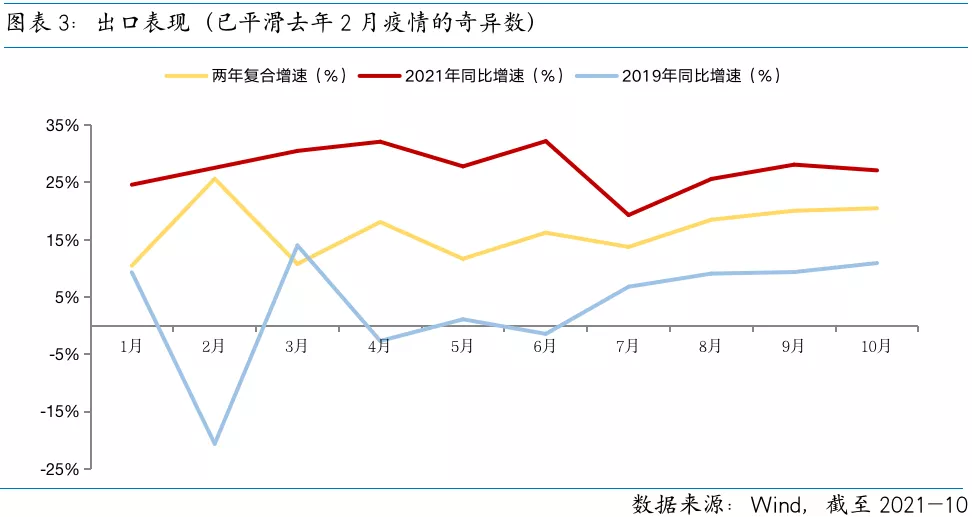 出口超预期,可改善悲观经济预期,但需要后续数据验证。10月美元计出口+27.1%,两年平均+20.48%,若剔除2月的低基数效应,10月出口两年平均增速年内最高,出口数据着实较好,这与数据样本偏东南沿海出口企业的10月财新PMI读数50.6%相契合。出口数据超预期,可以改善当前市场由于限电限产、三季度经济不及预期形成的悲观经济预期,但要大幅上修经济预期仍需10月金融数据等更多高频数据验证。因为10月有海外圣诞节备货因素,且今年海运不畅,导致海外买家可能存在重复下单的问题,所以10月、11月出口数据可能阶段性偏高,等圣诞效应过去观测增速持续性情况会更为客观。
