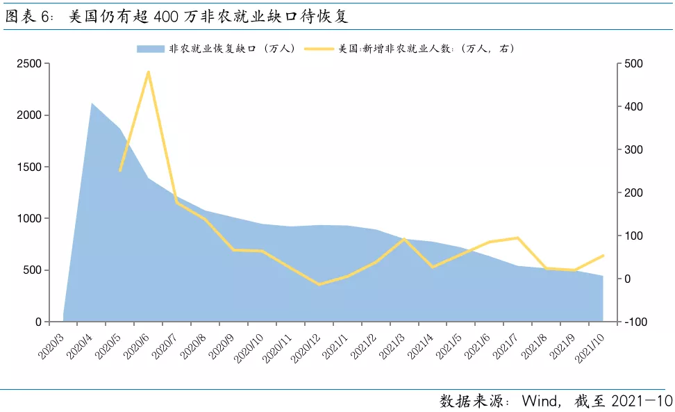 美国如期Taper,但就业市场仍需恢复,加息仍远,对市场影响减弱。上周联储宣布Taper落地,但联储主席鲍威尔坚称通胀是“暂时”的,对加息会保持“耐心”,整体表态偏鸽,因而市场的流动性预期改善推动美股继续走强。向后看,10月美国新增非农就业53.1万人,读数远高于8/9月,但当前美国仍有443.2万非农就业缺口待恢复,因此就业仍距联储目标有距离,加息仍远。明年年中后,加息可能是影响全球股市的重要变量,但年底其对全球股市影响小。