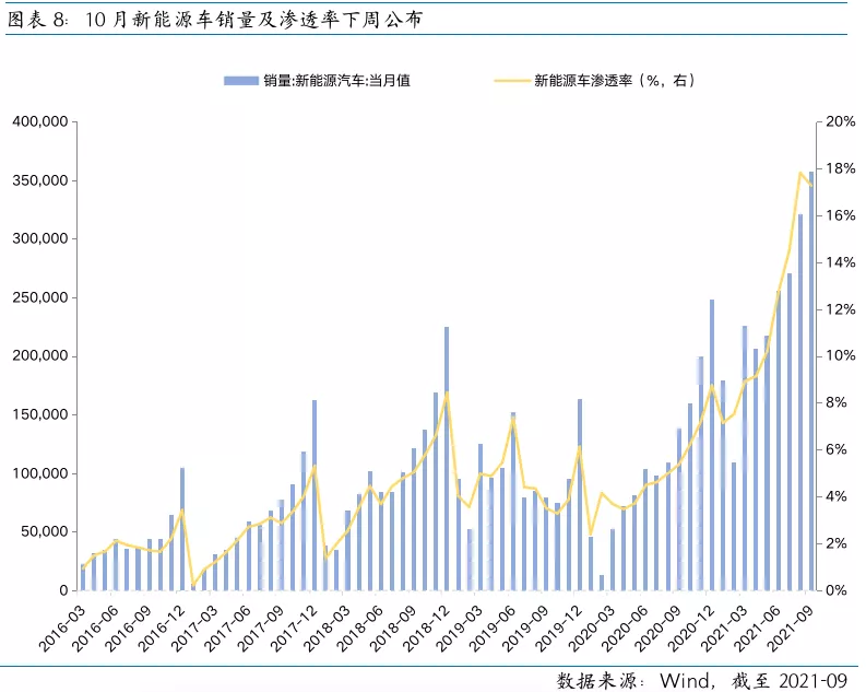 具体而言,新能源板块整体逻辑是政策支持力度大+景气度高。其中风电作为新晋的新能源赛道,估值绝对值相比新能源车、光伏低,值得更为关注。而新能源车则重点关注下周公布的10月新能源车销量和渗透率能否延续高景气,光伏则关注Q4抢装潮和硅料价格拐点确认情况。军工主要为事件催化,短期或有脉冲行情。电子则结构性关注IGBT板块,逻辑与新能源车较契合,下游新能源车的销量高增长带动了IGBT的需求攀升,从而行业景气度得到增强。