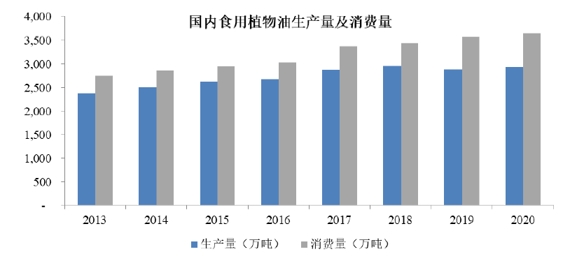 而食用植物油在中国消费结构中占据主要地位,食用动物油占比较低。2019年,中国食用植物油消费量为3,576万吨,相比于2018年增加136万吨,增幅4%,呈平稳增长趋势。