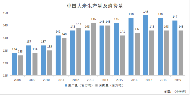 其二,近年来,随着中国传统农业结构的变化调整,畜牧业快速发展,奶业、水产业有了长足的发展,消费者对于大米等传统主食的需求进入了稳定阶段。从2013年开始,中国大米消费量保持相对稳定,2017年至2019年连续三年消费量保持在1.43亿吨上下。