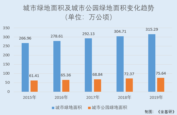 2015-2019年,国内城市绿地面积分别为266.96万公顷、278.61万公顷、292.13万公顷、304.71万公顷、315.29万公顷;城市公园绿地面积分别为61.41万公顷、65.36万公顷、68.84万公顷、72.37万公顷、75.64万公顷,均呈现稳步上升的趋势。