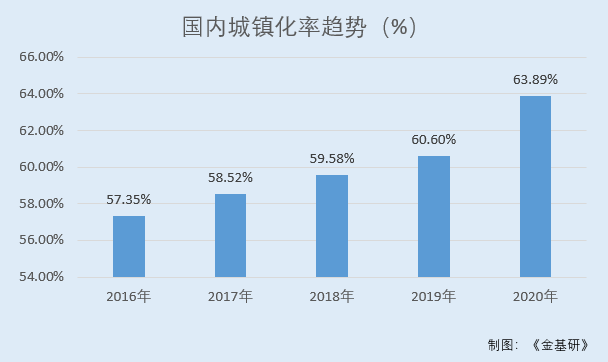 据国家统计局数据,2016-2020年,国内城镇化率分别为57.35%、58.52%、59.58%、60.6%、63.89%。虽然,国内城镇化率逐年上涨,但是与同时期发达国家的水平相比,国内城镇化水平仍有巨大的发展空间。