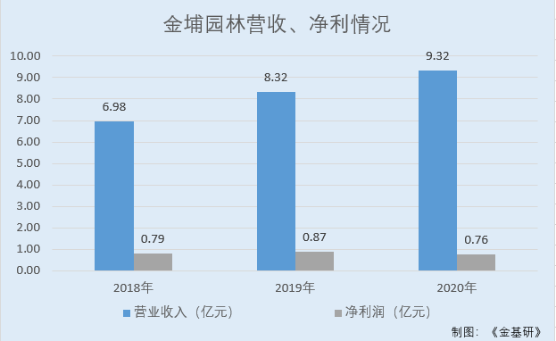 2018-2020年,金埔园林营业收入分别为6.98亿元、8.32亿元、9.32亿元,2018-2019年分别同比增长19.24%、12.06%。
