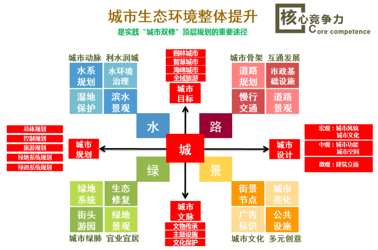 在面对城市生态系统提升需求时,金埔园林综合“五大要素”系统分析,明确规划理念和设计思路优缺点,并向客户提供完整的解决方案。五位一体规划是治理“城市病”、保障改善民生、提升城市品质的重大举措,落实“城市双修”的重要手段。