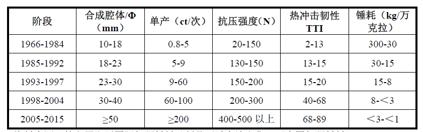 随着对人造金刚石合成设备、原辅材料、合成工艺等方面不断优化设计和有效控制,中国六面顶压机合成人造金刚石技术不断取得突破性进展,逐渐缩小与国际先进技术水平的差距,且生产成本明显低于国际水平。中国人造金刚石整体质量也得到了明显提升,在工艺指标和质量指标上均取得了较大进步。中国人造金刚石生产水平的发展情况如下: