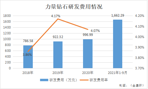 事实上,力量钻石始终坚持以技术研发创新为中心,2018-2020年及2021年1-9月,力量钻石研发费用投入分别为786.58万元、922.32万元、996.99万元、1,662.29万元,研发费用占营业收入的比例分别为3.86%、4.17%、4.07%、4.83%。