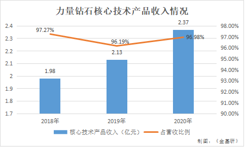 技术与产品融合方面。2018-2020年,力量钻石主要核心技术均系与金刚石单晶、金刚石微粉和培育钻石生产相关的技术,因此应用核心技术的产品收入即力量钻石的主营业务收入。其中,核心技术产品收入分别为1.98亿元、2.13亿元、2.37亿元,占营业收入的比例分别为97.27%、96.19%、96.98%。
