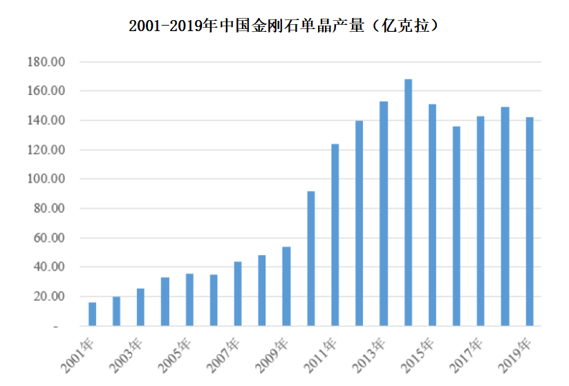 据招股书援引中国磨料磨具工业年鉴、第五届郑州国际超硬材料及制品研讨会论文,2001年至2019年,中国金刚石单晶产量由16亿克拉增加至142亿克拉,增长了7.9倍。自2000年开始,中国成为全球最大人造金刚石生产国,截至目前,中国金刚石单晶产量占全球总产量的90%以上。